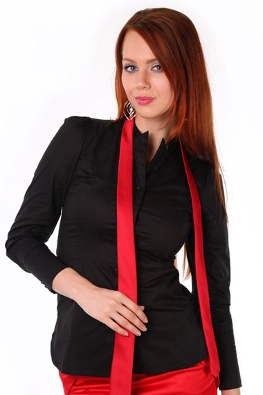 Элегантная черная рубашка с воротником стойкой, у которого острые уголки.